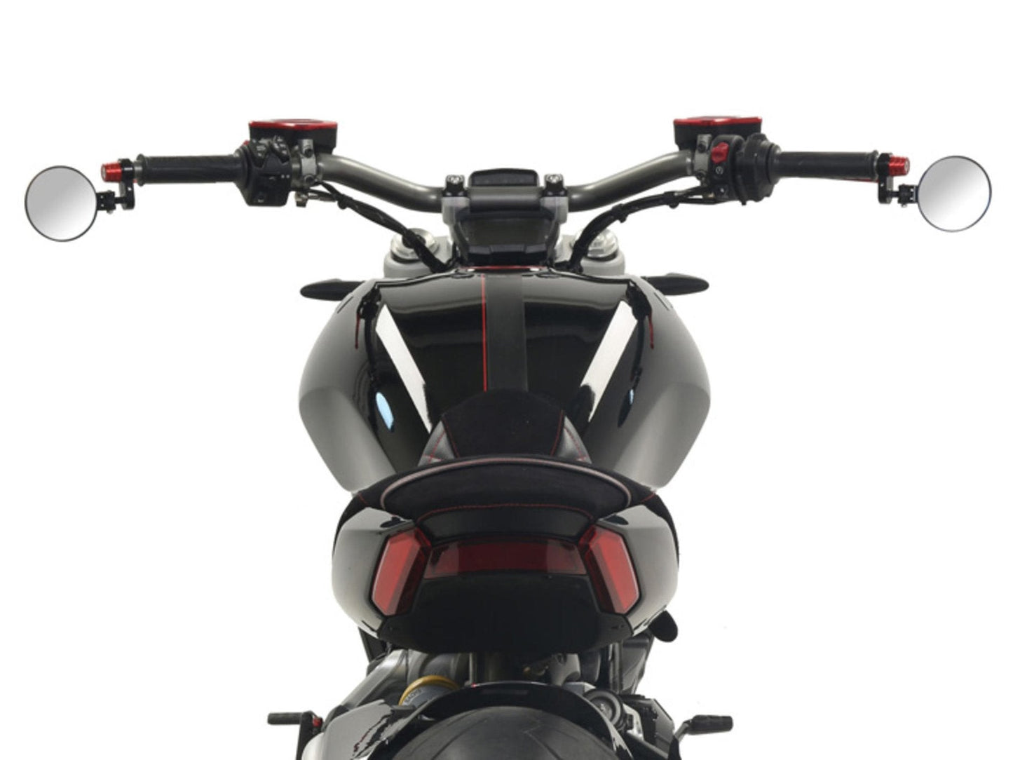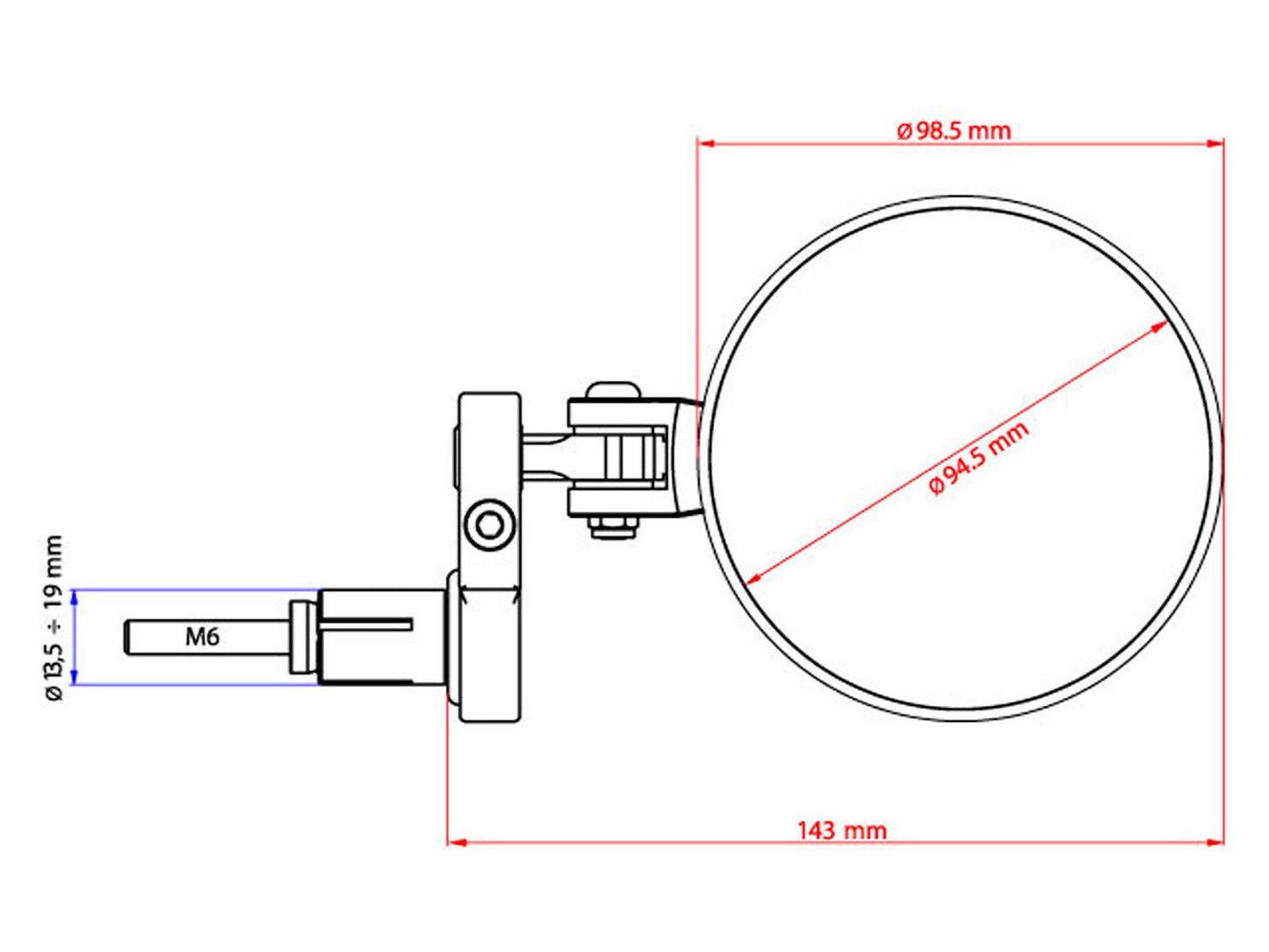 The useful area extends on an 94,5 mm diameter, to ensure the best possible visibility. The mirror can be fitted in either low or high position and is compatible with most handlebars, both original and non, with an expansion assembly system (handlebar internal diameter Ø 13,5 / 19 mm) or with a M6 screw (included).