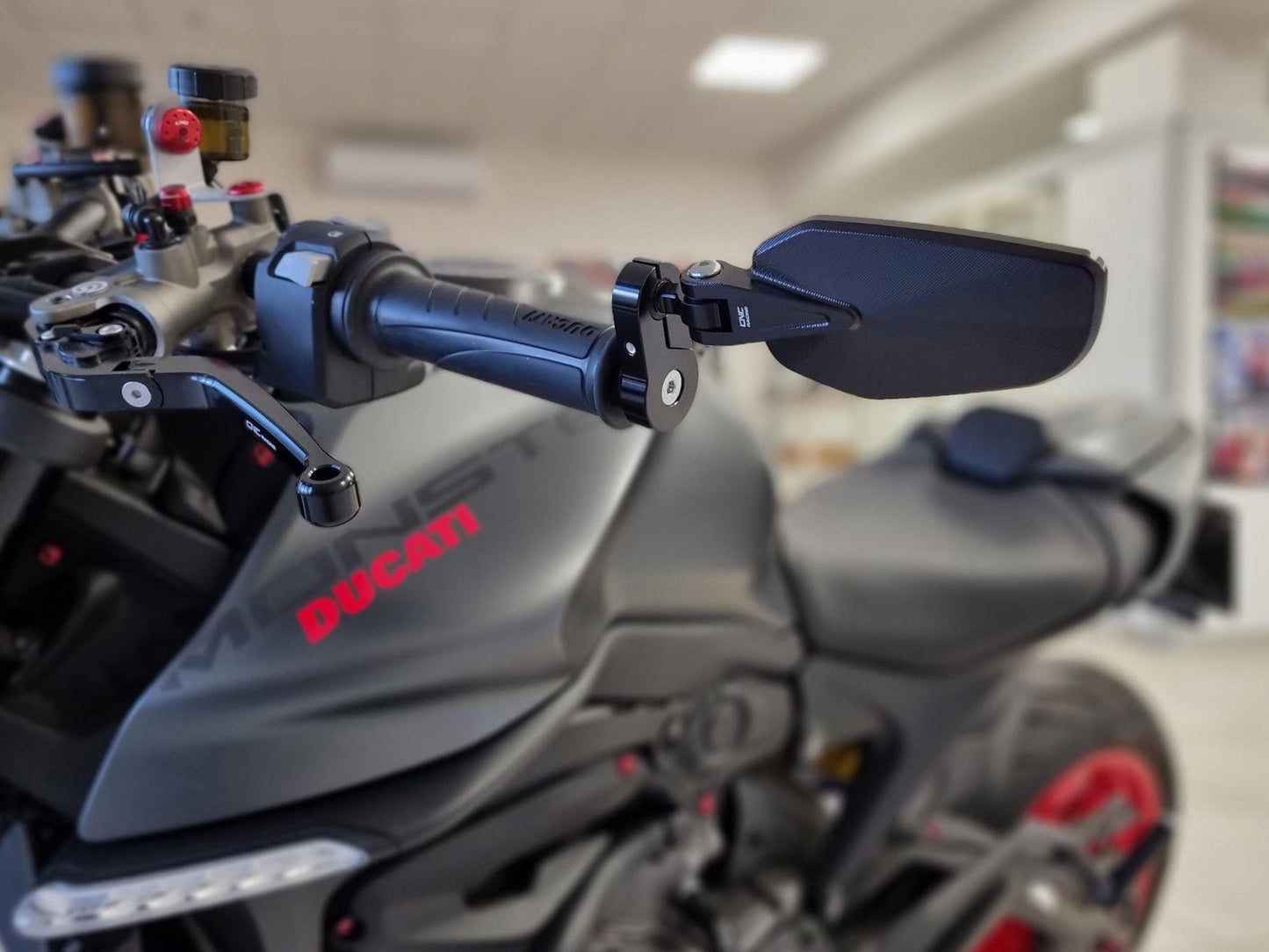 The mirror can be fitted in either low or high position and is compatible with most handlebars, both original and non, with an expansion assembly system (handlebar internal diameter Ø 13.5/19 mm) or with a M6 screw, included in the package.