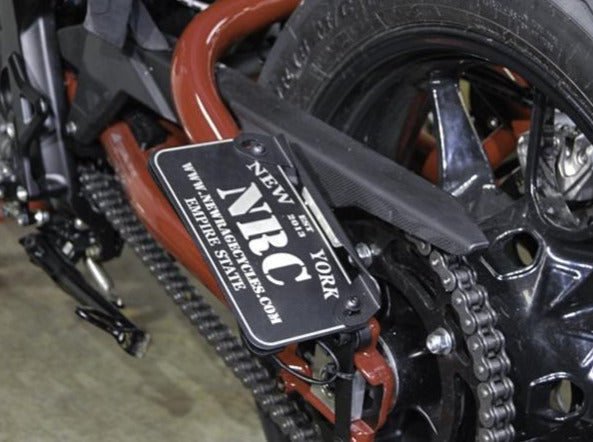 This kit eliminates the stock license plate bracket, but uses the same mounting location allows you to ride with your license plate mounted horizontally OR vertically!