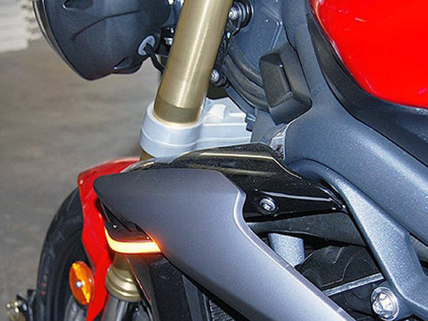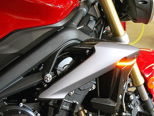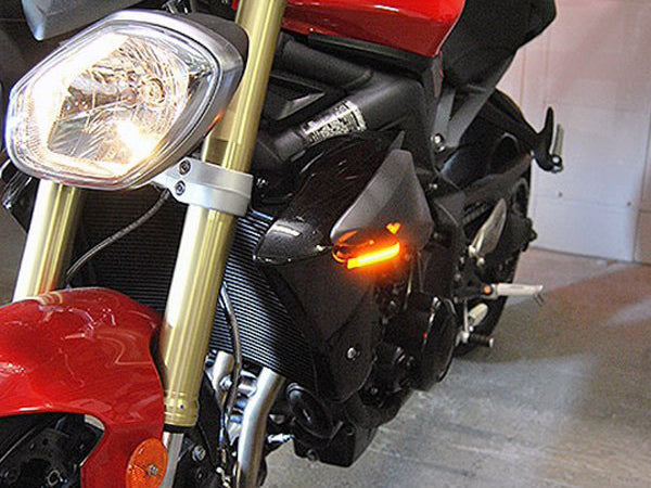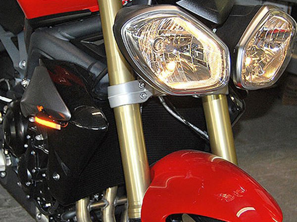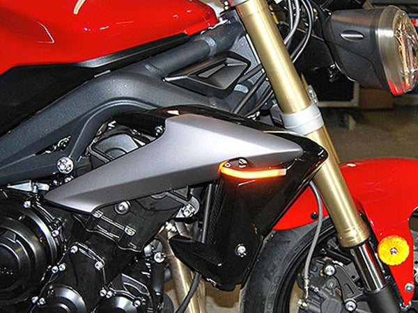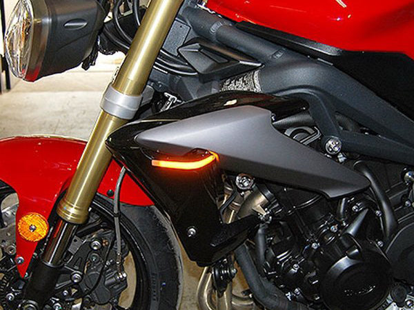 Triumph STREET TRIPLE front LED turn signals from New Rage Cycles is custom designed to save you time and money on installation, and lets you plug right in and ride on!