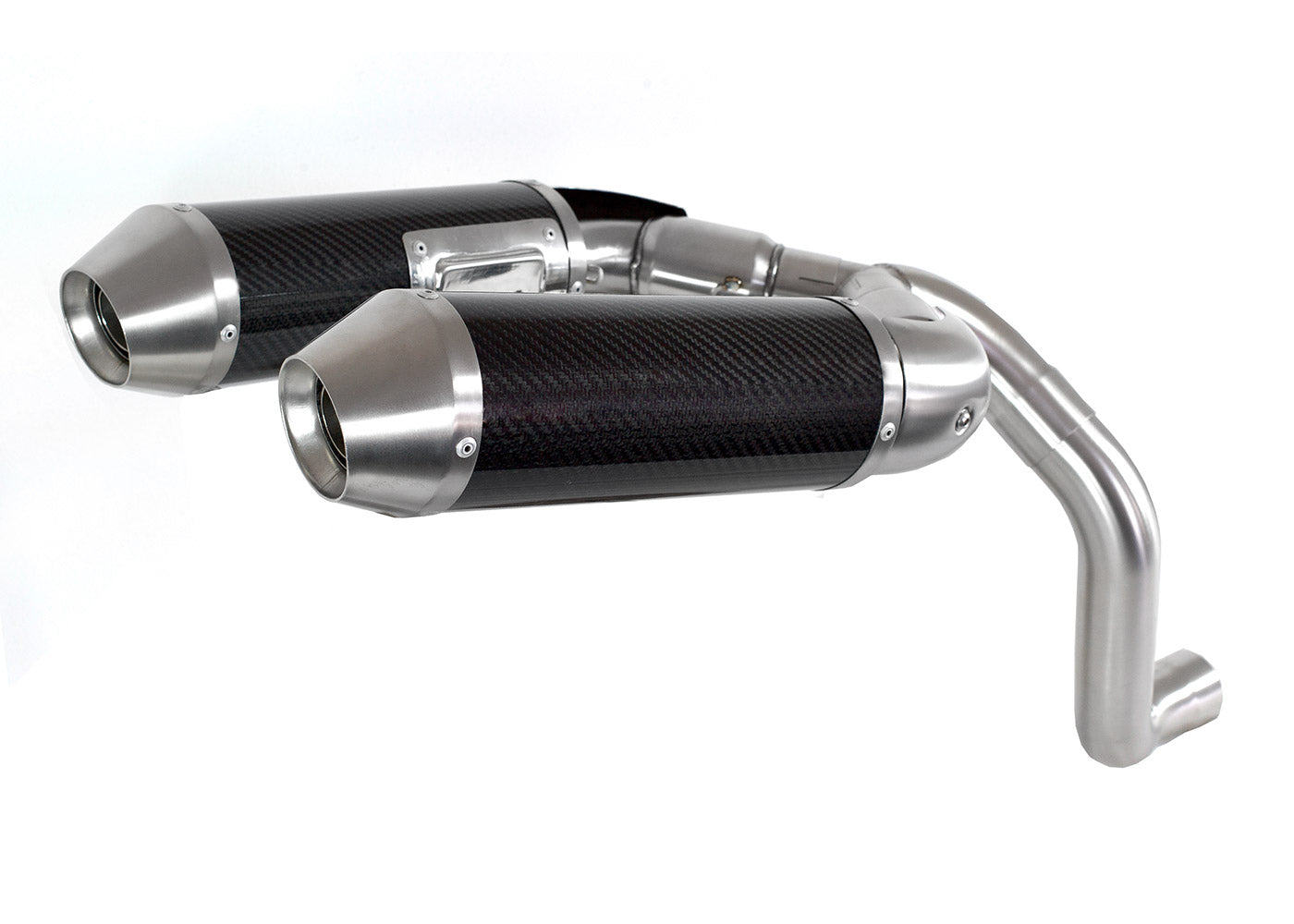 - Two round silencers with conic end cap are available in different versions / materials: carbon, dark style, stainless steel and titanium