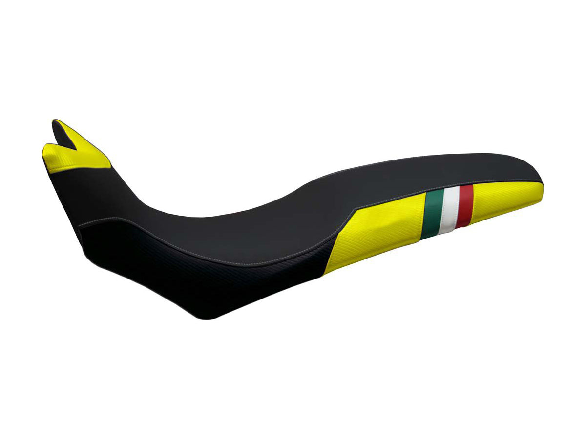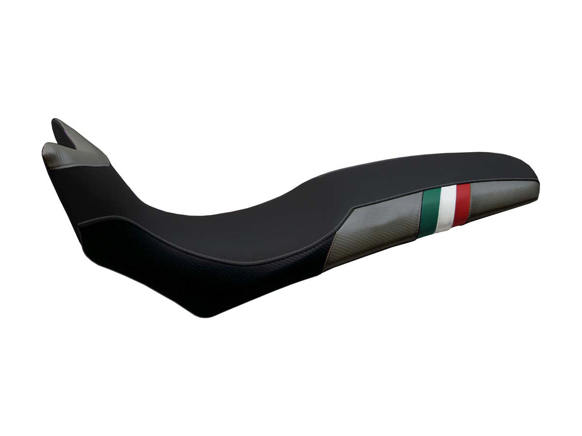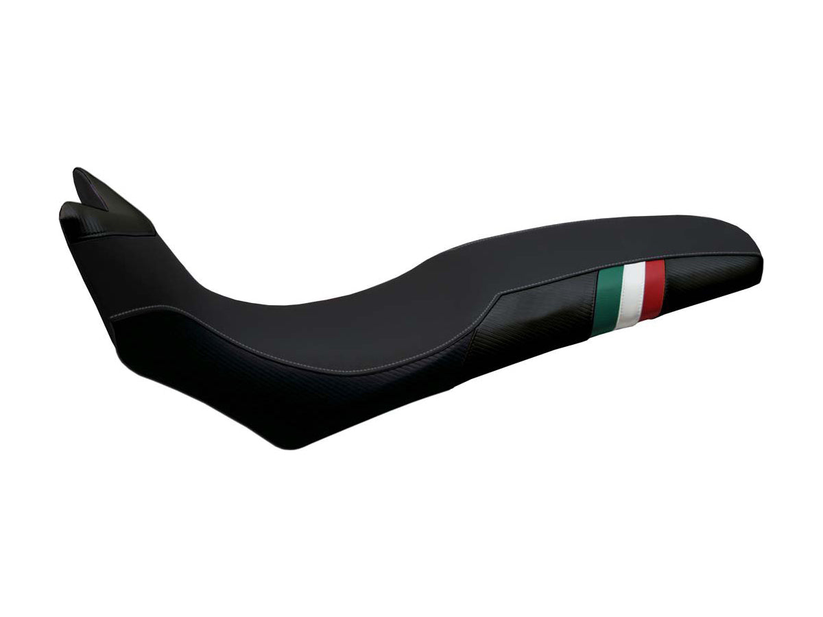 Exclusive seat cover made in black non-slip material and tricolor insert. Laterals in black carbon look and inserts.