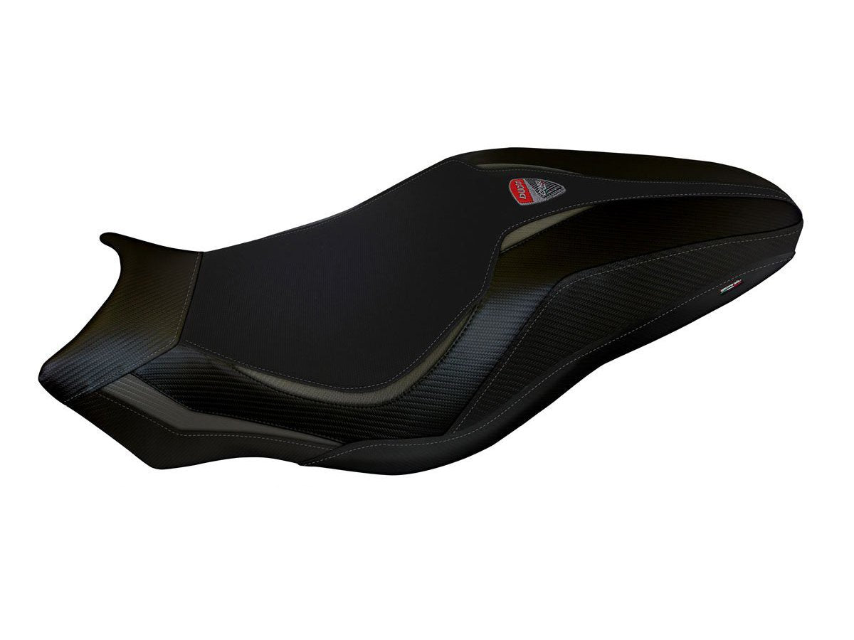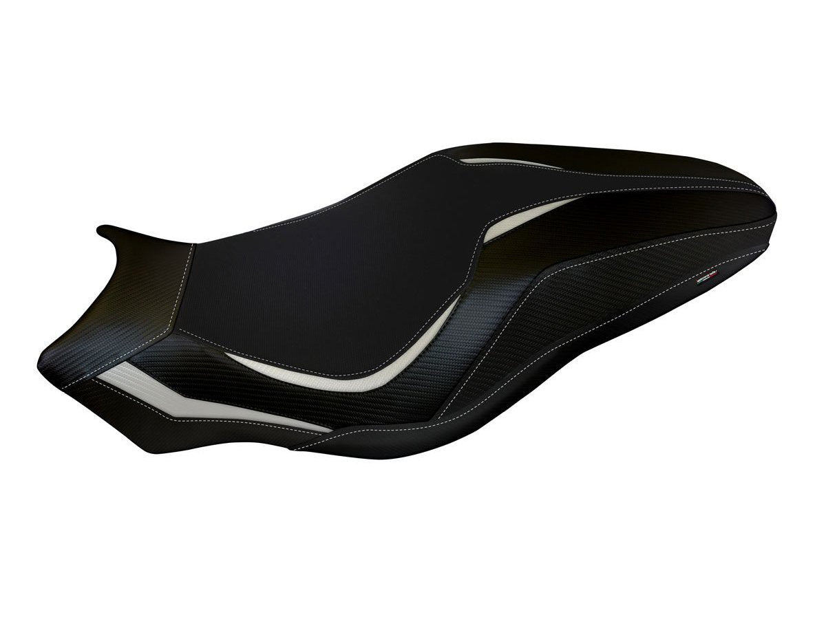 Exclusive seat cover made of black non-slip material. Laterals in black carbon look and inserts.