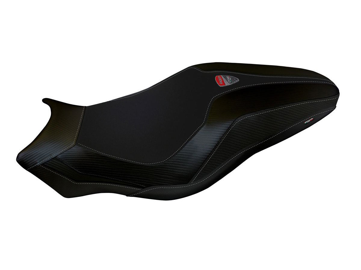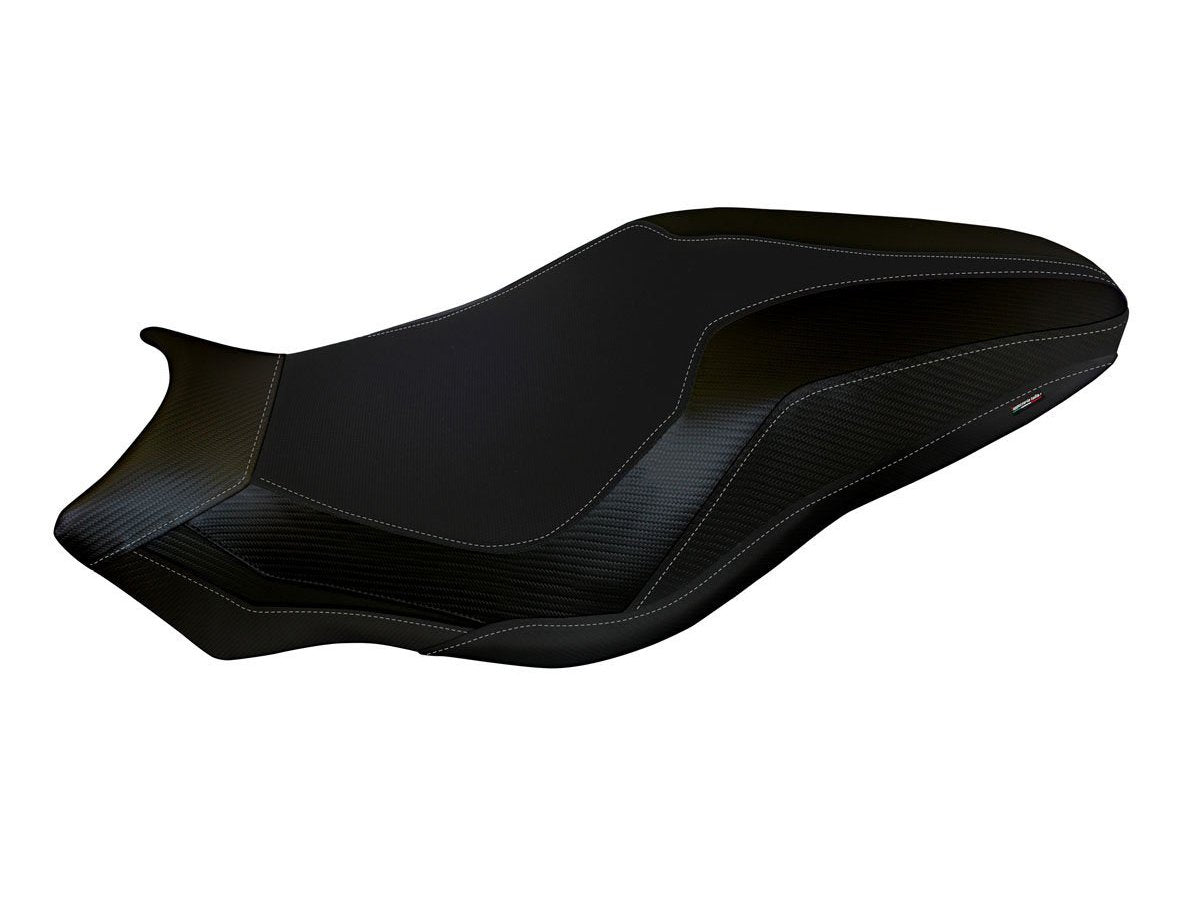 Exclusive seat cover made of black non-slip material. Laterals in black carbon look and seams.