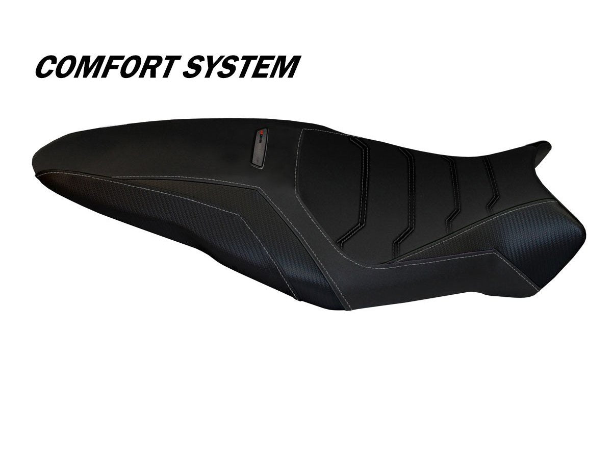 Exclusive seat cover made of black non-slip material. Laterals in black carbon look and seams.