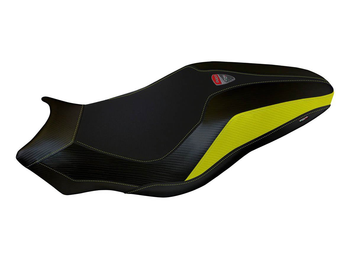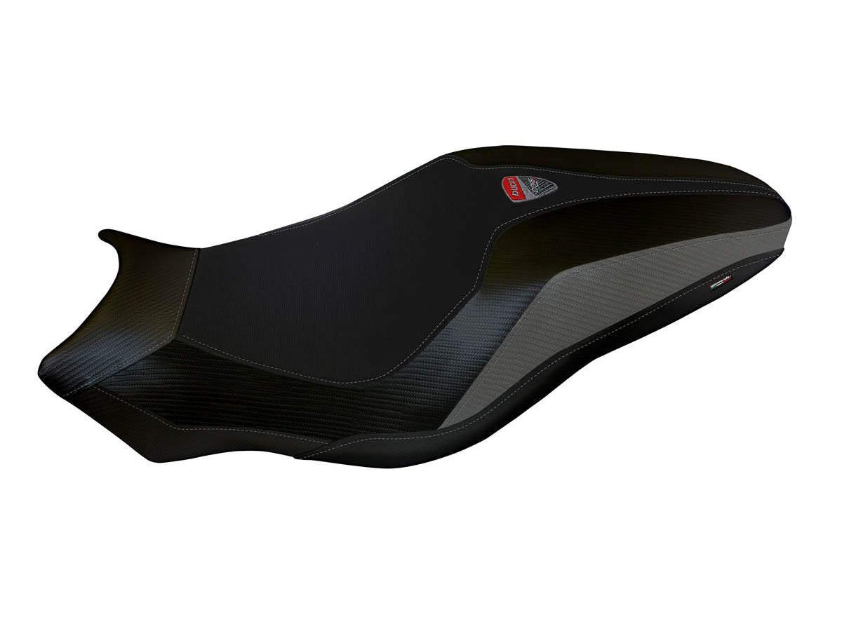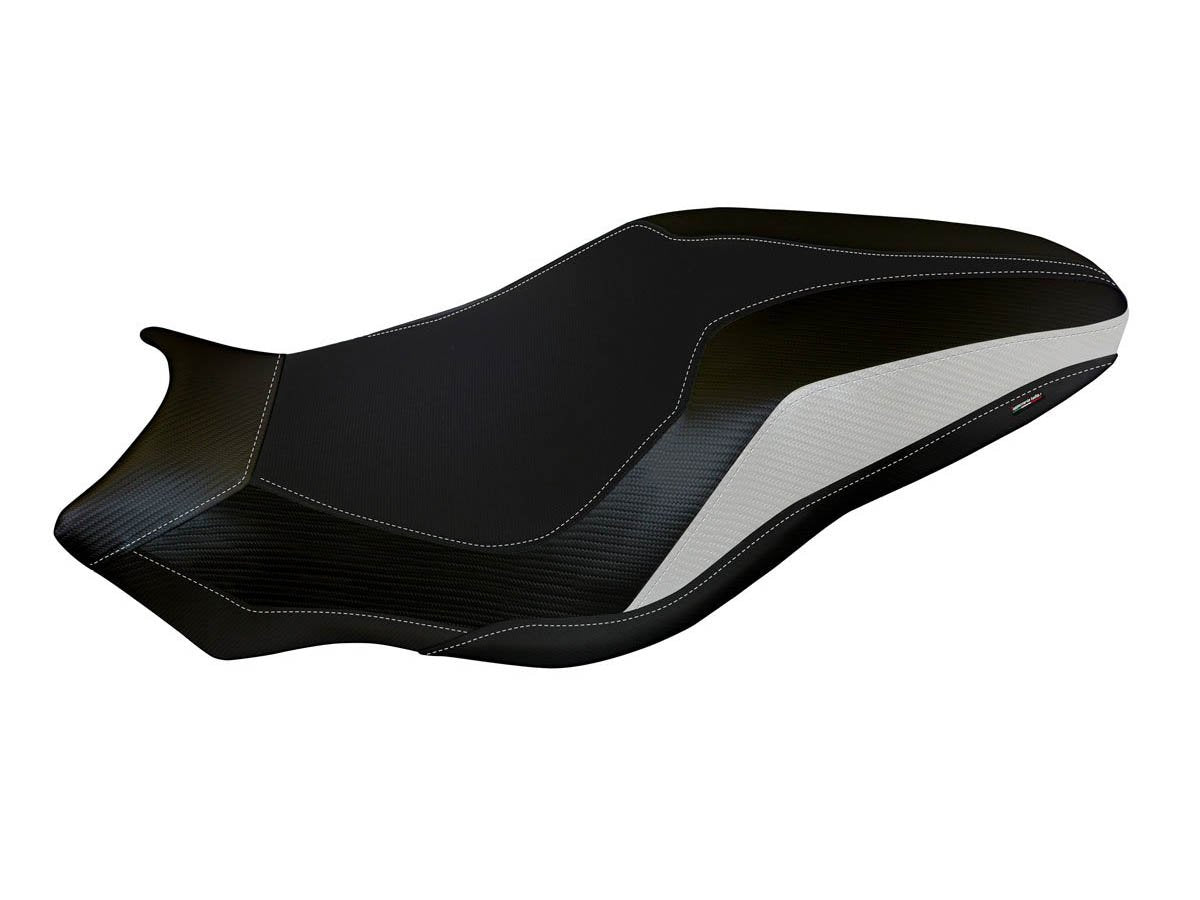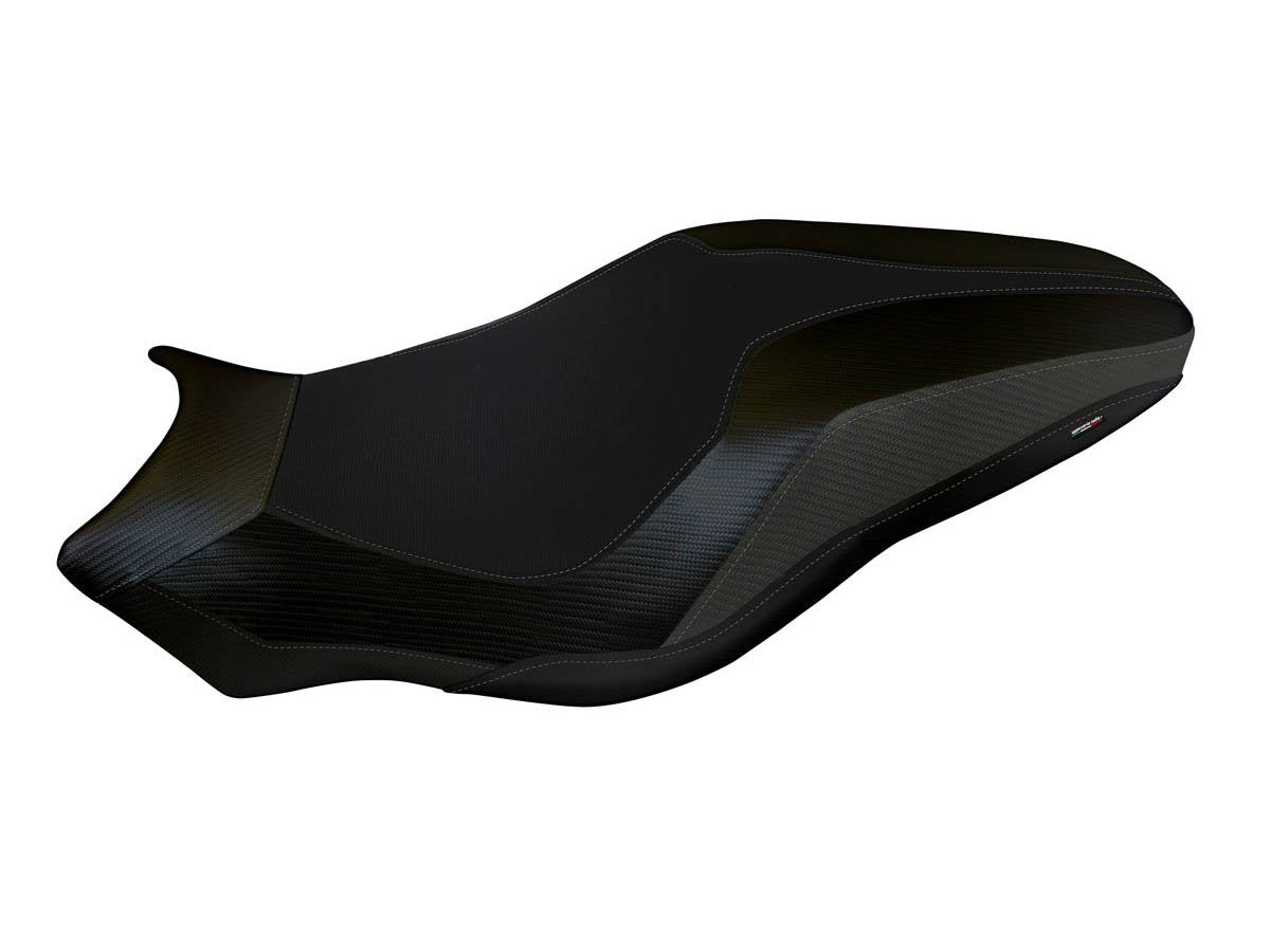 Exclusive seat cover made of black non-slip material. Laterals in black carbon look and inserts.