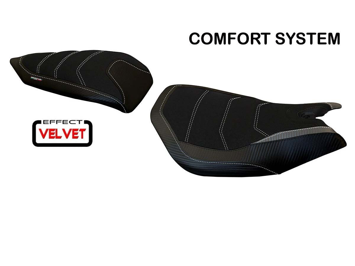 Exclusive seat cover made in black velvet effect above. Laterals in black carbon look and inserts.