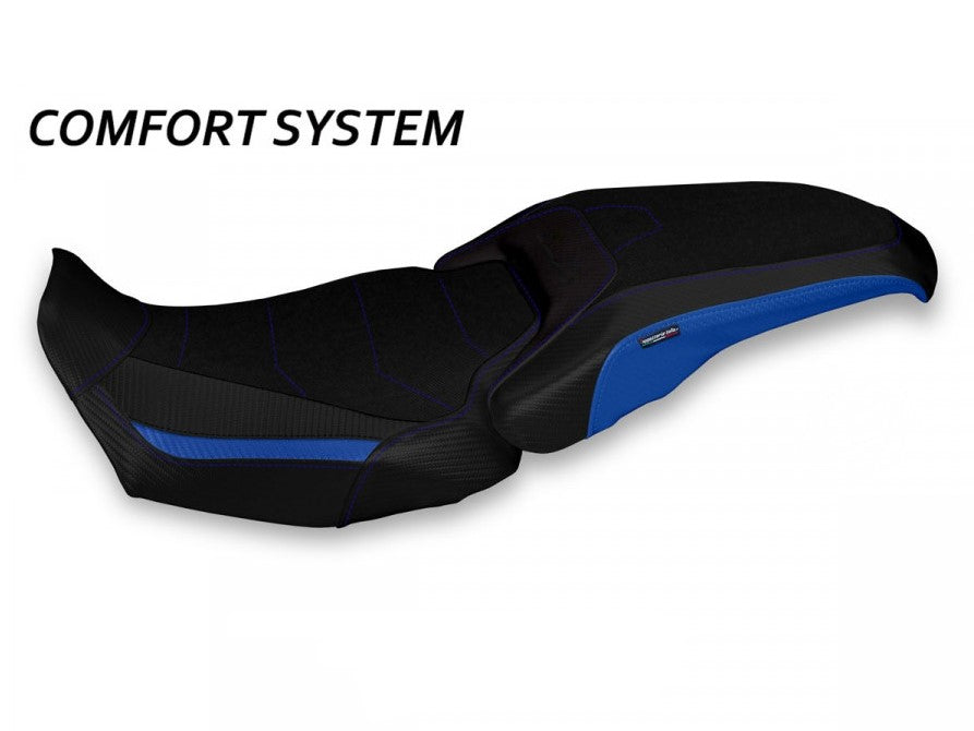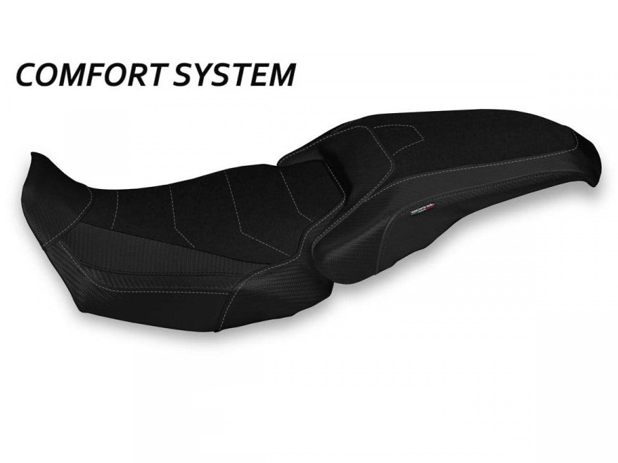 Exclusive seat cover made of black non-slip material. Laterals in black carbon look.
