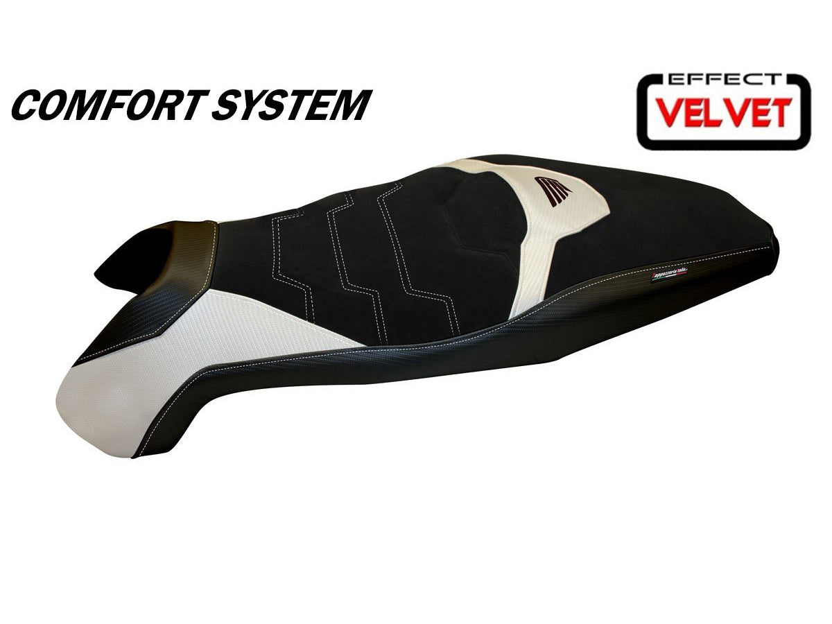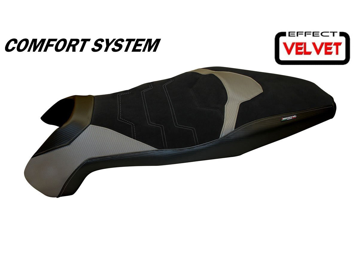 Exclusive seat cover realized in black velvet effect above. Laterals in black carbon look and inserts.