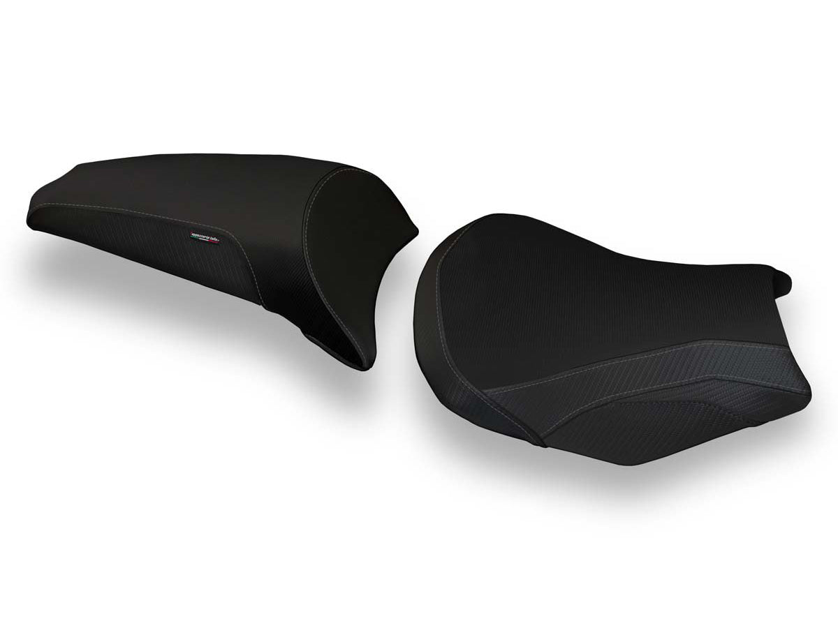 Exclusive seat cover made in black non-slip material, black carbon look and inserts.