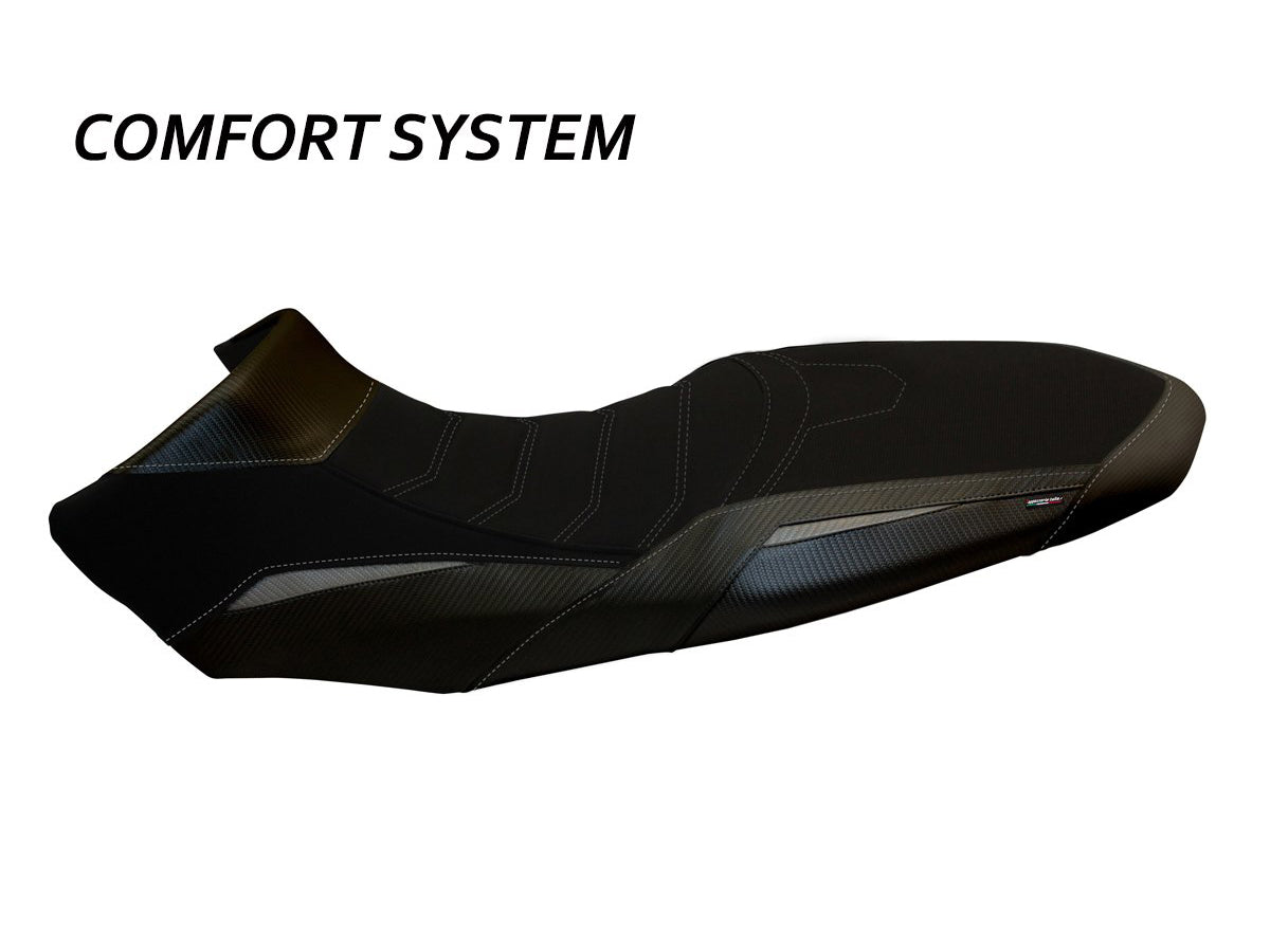 Exclusive seat cover made in black non-slip material. Laterals in black carbon look and inserts.