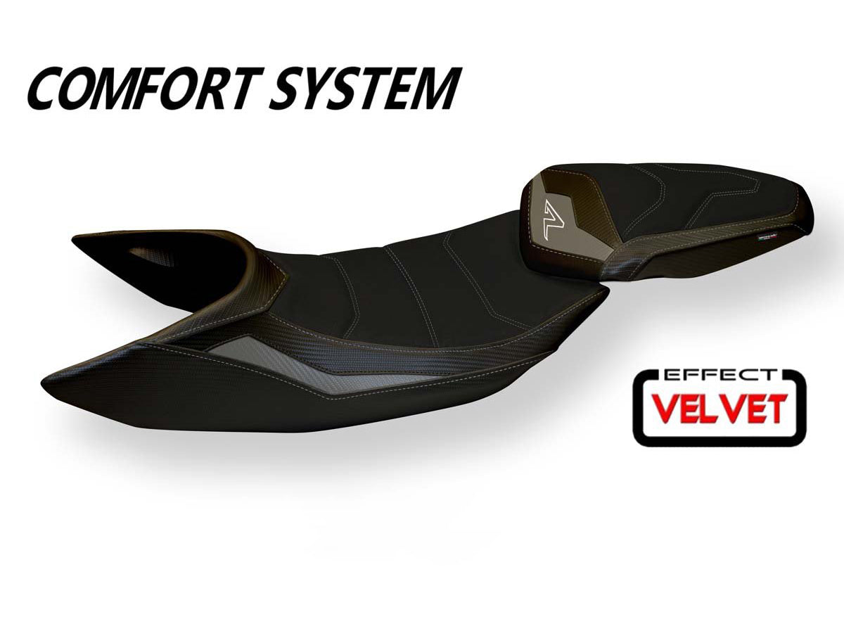 Exclusive seat cover made in non-slip material black velvet effect. Laterals in black carbon look and inserts.