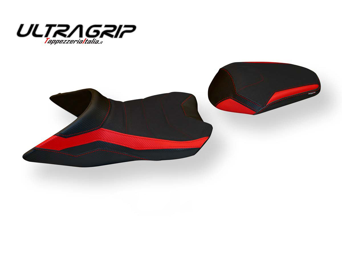 Exclusive seat cover made in material black ultragrip. Laterals in black carbon look and inserts.