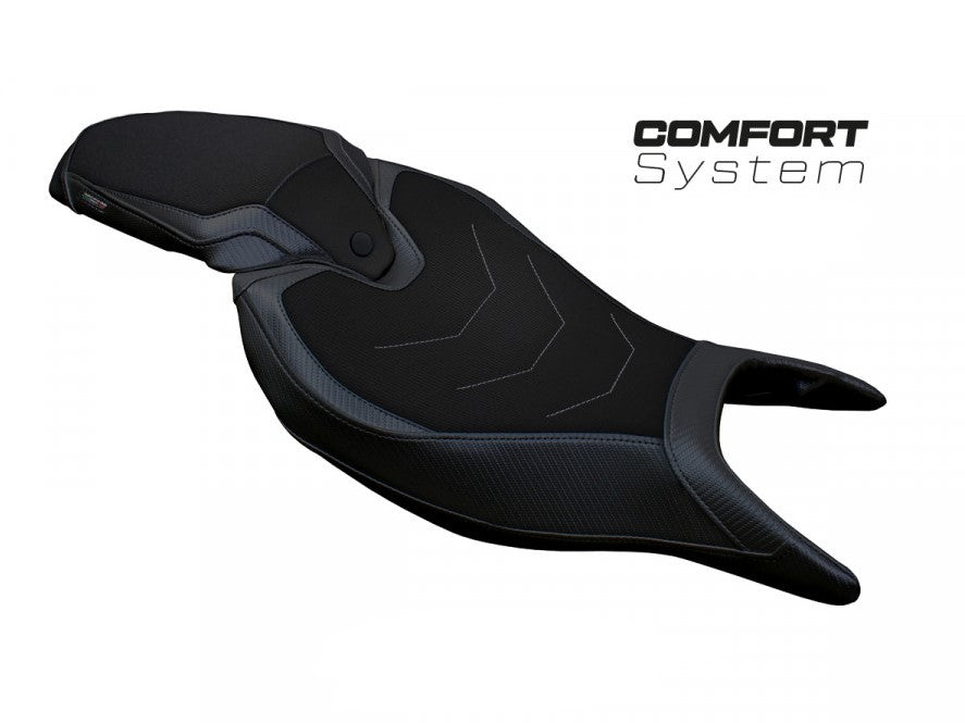 Exclusive seat cover made of black non-slip material. Laterals in black carbon look.