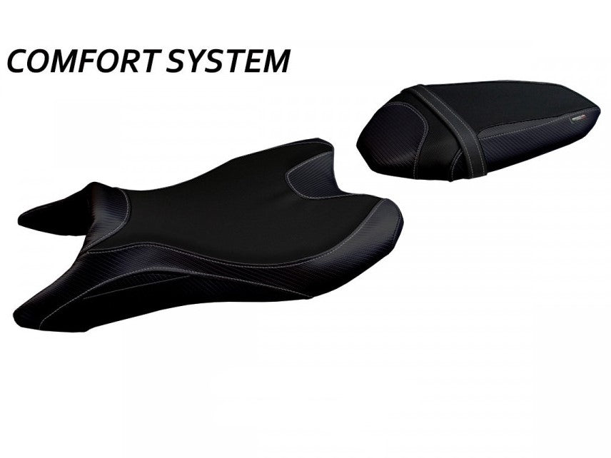 Exclusive seat cover made of black non-slip material. Laterals in black carbon look.