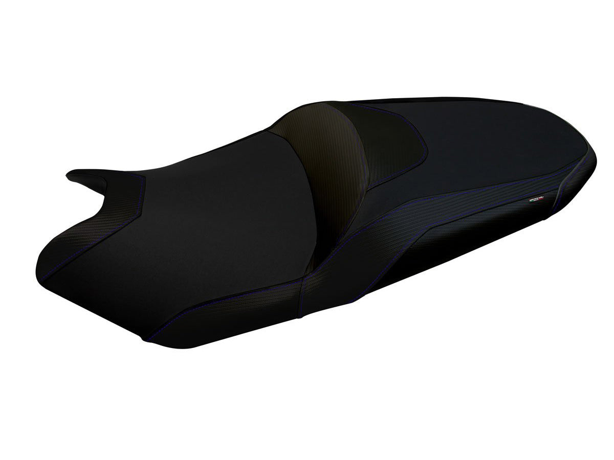 Exclusive seat cover made in black non-slip material, black carbon look and seams.