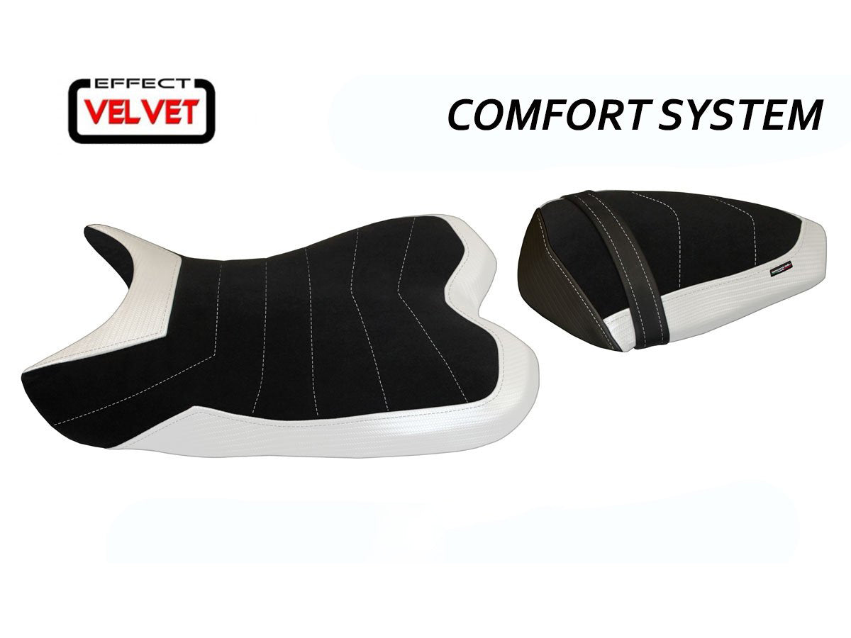 Exclusive seat cover made in black velvet effect above. Laterals in black carbon look and inserts.