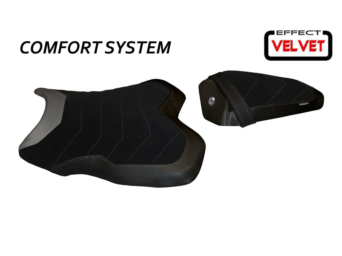 Exclusive seat cover made in black velvet effect above. Laterals in black carbon look and inserts.